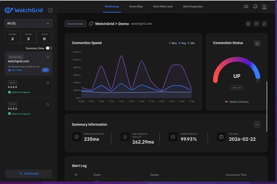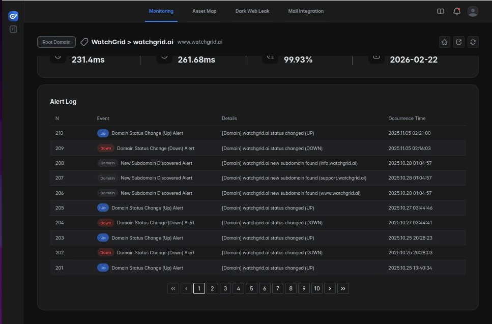 Detect potential domain hijacking, expired registrations, and unauthorized changes instantly.
